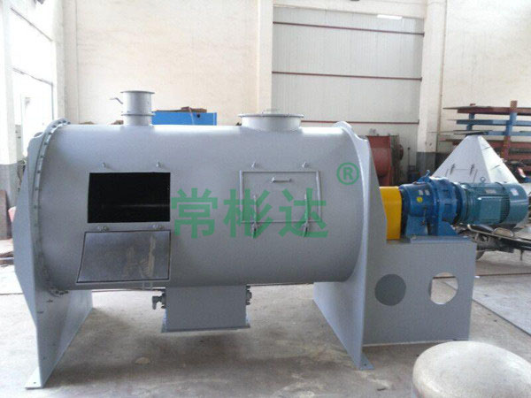 該機型由傳動機構(gòu)、臥式筒體、犁刀、飛刀四部分組成,物料在犁刀作用下沿筒壁作軸向流支,當物料流經(jīng)飛刀時被高速度旋轉(zhuǎn)的飛刀拋灑,從而在較短時間內(nèi)達到均勻混合。